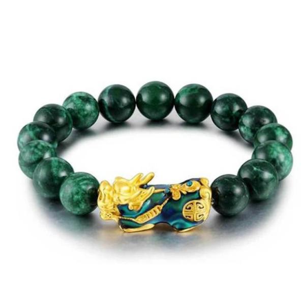 Bracelet features a beautiful string of cyan jade beads with a PiXiu charm. The Pi Xiu is a talisman designed to bring riches to your home or office. It is trusted by gamblers for luck and by business owners for success. The Pi Xiu, combined with Cyan Jade in this bracelet brings success and protection. It also has a great way of making things easier for the user. You can say goodbye to failure and ill-luck with this bracelet.